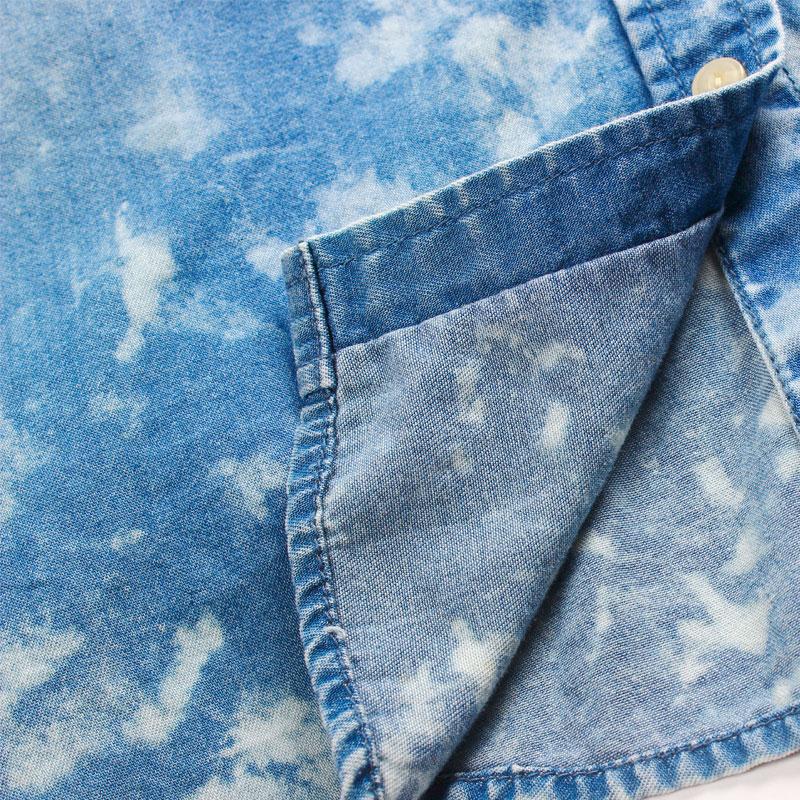 Brief Description:Batwing- sleeved denim shirt,with fisheye button closed,garment snow washing and created a different appearance :white cloud and blue sky