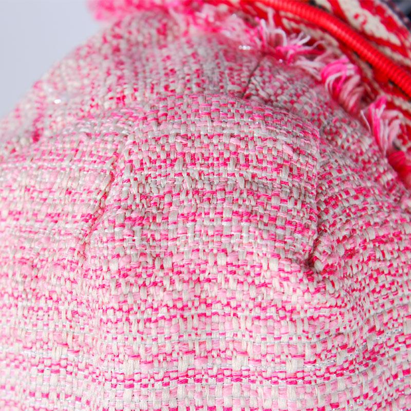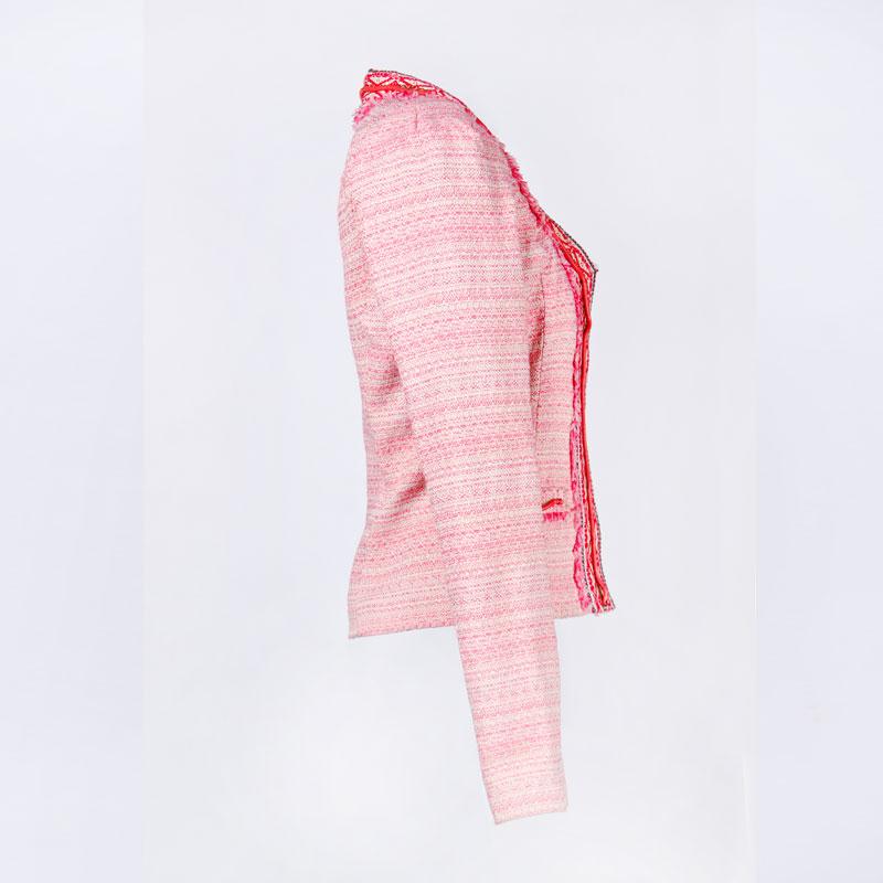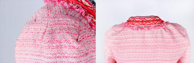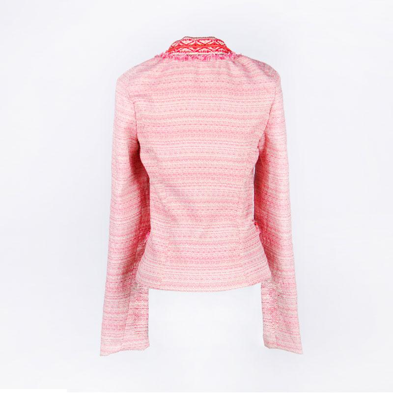 Brief Description:raw edge and classic pattern decorated、round neck 、full lining , sliver thread inserted fabric,short style