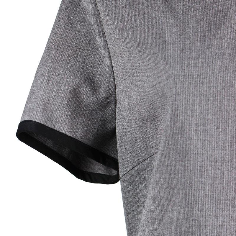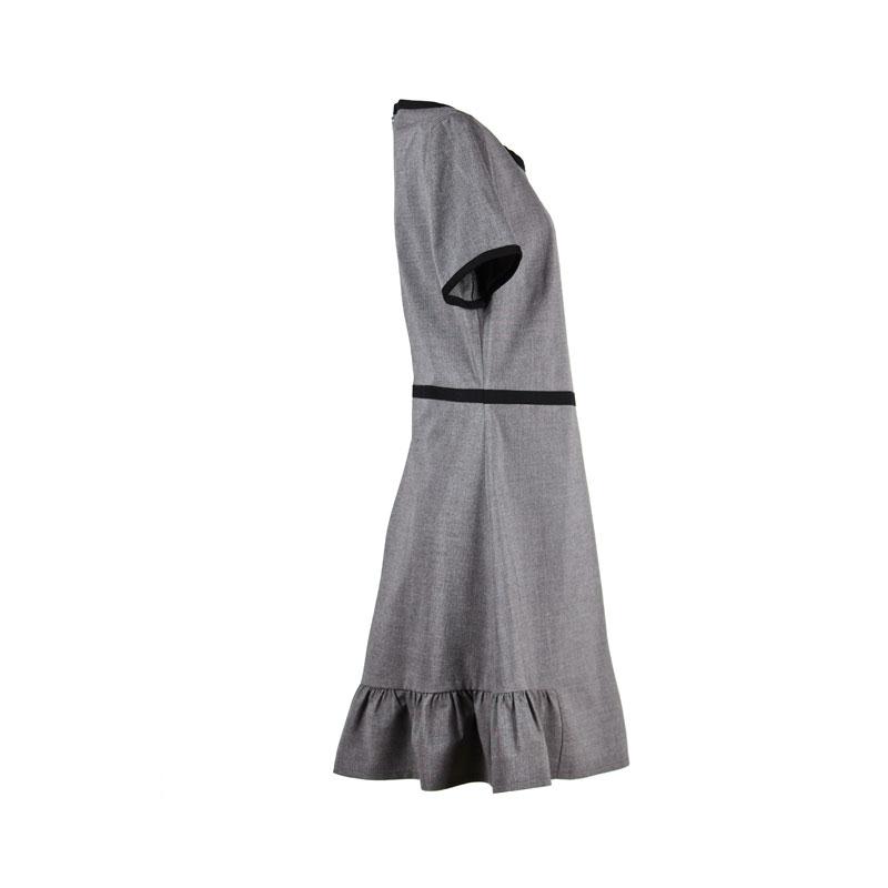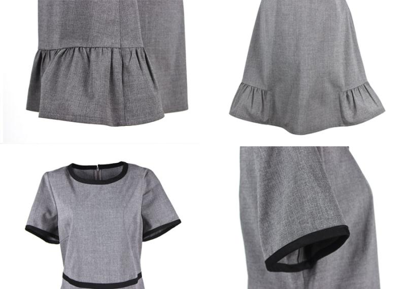 Brief Description:invisible zipper in back , black color binding in collar and sleeve cuff,lotus leaf bottom,dark grey ground--show a air of succinct and elegance